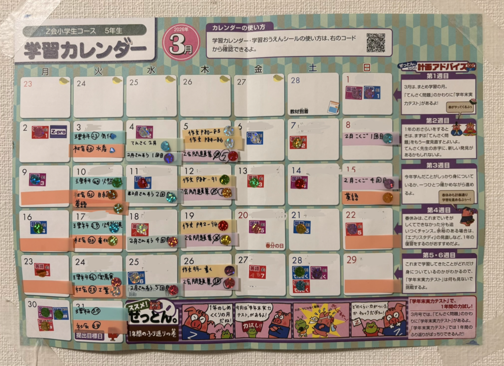 5年生最後の月。Z会の教科シールと、付箋で追加した市販テキストの予定が並んでいます。3年間積み上げてきた感じが出てる、と自分でも思う一枚です。