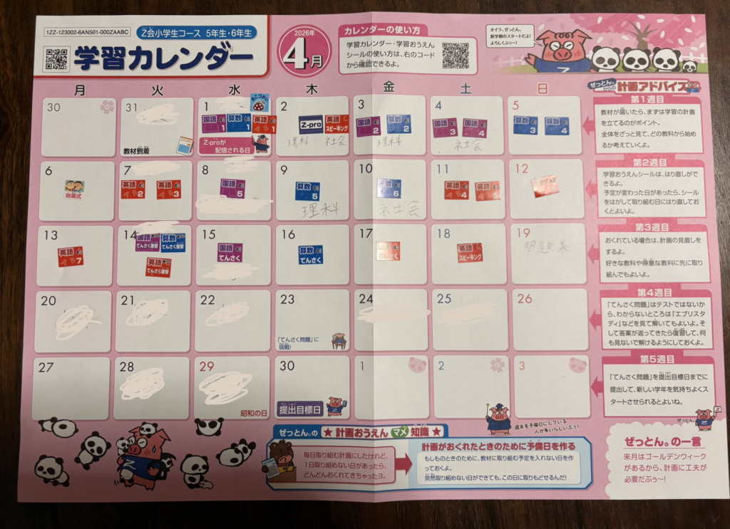 Z会の小学生コースには、毎月自分でシールを貼って完成させるカレンダーがついてきます。教科ごとのシールを自分で選んで、「今日はこれをやる」と決めて貼る。